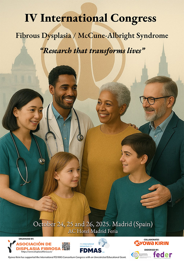 It is with great pleasure that we announce the International Congress on Fibrous Dysplasia and McCune-Albright Syndrome, which will be held on October 24, 25 and 26, 2025, in Madrid, Spain. The Madrid 2025 International Congress will bring together patients, families, physicians, researchers, and emerging researchers to break down silos, build community, and create alignment to advance research and treatments for Fibrous Dysplasia/McCune-Albright Syndrome (FD/MAS).